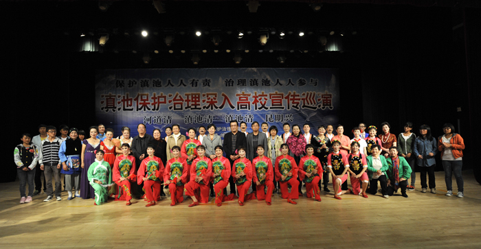 为在广大师生中宣传滇池环保理念,进一步提高师生环保意识, 11月15日晚,由昆明市部分离退休老同志组成的昆明滇池阳光艺术团在我校学生会堂上演“滇池保护治理”为主题的文艺演出。我校副校长熊晶,昆明滇池(湖泊)污染防治合作研究中心主任钱春萍,农学院党总支书记王德斌、院长黄鹤平,旅游学院党总支书记张士芬、副书记杨光明、副院长吴跃辉,音乐学院院长靳丽芬及部分学生代表观看了演出。
