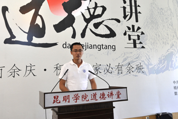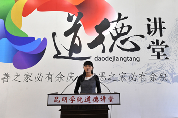 讲堂由“唱歌曲、学模范、诵经典、发善心、送吉祥”五个环节组成,紧扣学习付贵帅同学舍己救人,弘扬乐于助人的精神主题,从不同角度、不同层面讲述付贵帅高尚的道德精神,还原师生心目中真实的付贵帅。在全场人员深情齐唱《爱的奉献》后,讲堂进入学模范环节,重温由昆明电视台、昆明日报、都市时报等多家媒体联合专访付贵帅同学见义勇为事迹的新闻短片视频,再次向师生还原付贵帅同学舍己救人的壮举。观看新闻短片后,付贵帅高中、大学的同班同学张丽仙宣讲的《我的老同学》,阐述了一个积极向上、好学阳光的付贵帅;大学同班同学何俊宣讲的《我心中的付贵帅》,讲述了一个助人为乐的付贵帅;班长王智弦宣讲的《忆付贵帅》,诠释了一个热爱班级体、不是班委却胜似班委的热心同学;班主任陆晓莉老师宣讲的《怀念我的学生》,强调了帮助是他的一种习惯;父亲付世铜宣讲的《我的好儿子付贵帅》,肯定了一个孝敬长辈、体贴父母、关爱他人、珍情重义、乐于助人、热爱劳动的好孩子。在诵经典环节中,全体与会人员朗诵:“生,亦我所欲也,义,亦我所欲也。二者不可得兼,舍生而取义者也。”在发善心环节中,主持人希望全体人员激发善心,抒发善意,胸怀“厚德善行,吉祥相伴。”最后,送吉祥环节,宣讲员向全体与会人员顺序依次送上吉祥卡,告诫我们:勿以恶小而为之,勿以善小而不为。
