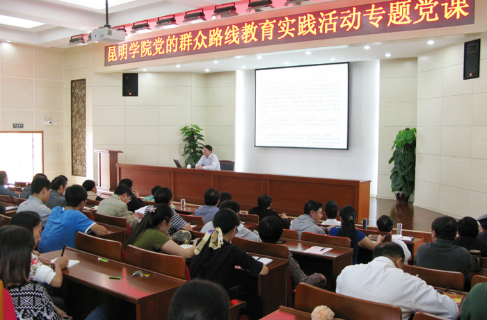 首先,陈书记讲解“为什么要在全党深入开展党的群众路线教育实践活动?”陈书记从胡锦涛、习近平的一系列讲话,党的十八大报告、《文化纵横》等关于群众路线的观点,中共中央通过调研、问卷、座谈、抽样等方式归纳总结的“四风”方面的22种表现,紧紧围绕党的十八大精神,为大家阐述了“在全党深入开展党的群众路线教育实践活动”的目的意义。党的十八大明确提出围绕保持党的先进性和纯洁性,在全党深入开展以为民务实清廉为主要内容的党的群众路线教育实践活动,这是新形势下坚持党要管党、全面从严治党的重大决策,是顺应群众期盼、加强学习型服务型创新型马克思主义执政党建设的重大部署,是推进中国特色社会主义伟大事业的重大举措。我们要坚持围绕中心、服务大局,把作风建设放在突出位置,以作风建设的新成效凝聚起推动学校事业发展的强大力量。
