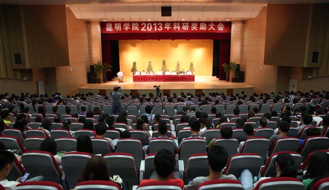 为全面贯彻落实党的十八大关于加快实施创新驱动发展战略部署,深入学习、宣传、贯彻全省科技创新大会《中共云南省委、云南省人民政府关于实施建设创新型云南行动计划(2013-2017)的决定》,充分发挥科技对经济社会发展的支撑引领作用,坚持以科研为龙头,促进创新人才的成长、调动广大教师学生的科研积极性,促进师生积极投身科学研究,推出更多、更高水平的科研成果,表彰在2012年各类科研活动中取得优异成绩的老师和学生,学校于2013年6月28日下午在学生会堂召开2013年科研奖励大会。学校党委书记陈世波,校长蒋永文,党委副书记孙勇、李媛芬,副校长李翔、熊晶、罗明东、董建华出席,各职能部门负责人,各教学单位党政主要负责人及分管科研工作负责人、科研秘书,获得2012年度科研奖励的全体教职工,“挑战杯青年学术科技作品竞赛”获奖学生,各教学和科研单位教师代表、学生代表共1300多人参加了会议。大会由熊晶副校长主持。