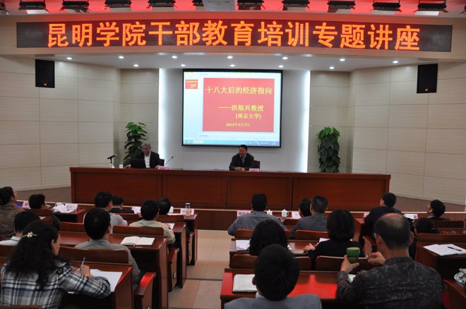 5月7日上午,南京大学党委书记洪银兴教授应我校邀请,为我校干部教育培训作《十八大后的经济指向》专题讲座,深入阐释了“中国的扩大内需和经济的长期增长”问题。我校党委书记陈世波、校长蒋永文等在校校领导和全体中层干部、机关科级干部、经济学院部分师生代表聆听了讲座。讲座由我校党委书记陈世波主持。