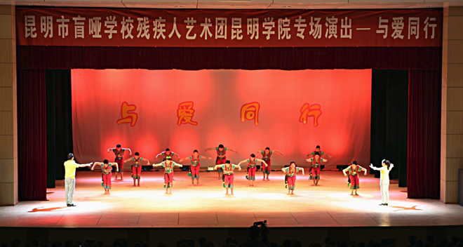 4月19日下午,昆明市盲哑学校残疾人艺术团“与爱同行”专场文艺演出在我校学生会堂举行。校领导、中层干部、各院系团总支书记、辅导员和部分师生代表1300多人观看了演出。