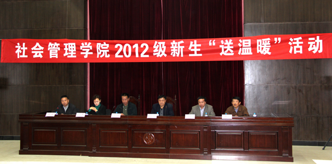 11月28日下午,社会管理学院在模拟法庭举行“2012级新生送温暖活动”。学校党委副书记孙勇、副校长李翔出席本次活动。