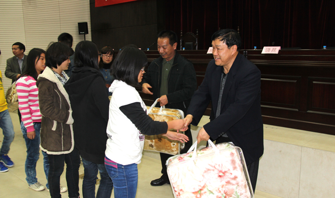 最后孙副书记、李副校长向我院获得冬衣补助的同学发放了御寒毛毯。