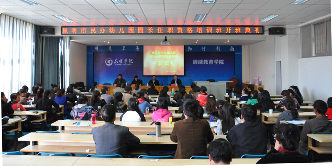 昆明市幼儿园园长任职资格培训班由我校继续教育学院承办,云南省幼儿教师培训中心具体组织实施。培训的主要目标是主要帮助民办幼儿园园长全面掌握国家有关幼儿教育的政策法规,培养其现代教育理念和科学的办园思想,丰富幼儿教育知识,拓展专业视野,真正做到懂保育、会教育、善管理。培训内容主要包括学前教育形势和政策法规、学前教育理论、学前教育管理及方法等。培训采取专题讲座、现场观摩、经验交流和实地考察相结合的方式,集中培训时间为10天。