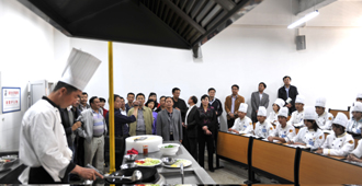 我校副校长熊晶率校办主任杨跃、组织部长杨璐、科研处长王定康、农学院院长黄鹤平等部门负责人,热情接待曾柏岺副校长一行并陪同来宾参观了轨道交通实验室、烹饪实验室和酒水实验室。