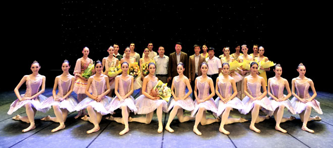 辽宁芭蕾舞团此次来昆的70余位演员为我校师生呈现了一场品味高雅、美轮美奂的芭蕾盛宴。演出在唯美浪漫的经典芭蕾舞剧《仙女》中盛妆启幕,演员们用精湛的舞技精彩演绎了中外芭蕾舞的经典与现代之作。现代男子群舞《男人》阳刚雄武、活力四射;古典芭蕾舞剧《海盗》生动唯美、激情奔放;现代女子群舞《茉莉花》优雅曼妙、赏心悦目;精选节目《芭蕾集锦》节奏明快、酣畅淋漓;情景芭蕾《江山美人》如歌如泣、激昂悲壮;现代二人舞《无欲无虑》动感协调、引人入胜;世界经典舞剧《天鹅湖》双人舞揭示了对生命,对爱情的无限憧憬;而中国芭蕾舞剧《二泉映月》中的经典桥段《梦中追月》成功的将听觉向视觉转化,实现了一次文化层面上的中西合璧,美不胜收、感人肺腑。整台演出精彩纷呈、高潮迭起,赢得了全场师生经久不息的热烈掌声。最后,演出在辽宁芭蕾舞团全体演员带来的原创作品《芭蕾风采》中徐徐落下帷幕。演出结束后,陈世波书记还亲切地与演员们合影留念。