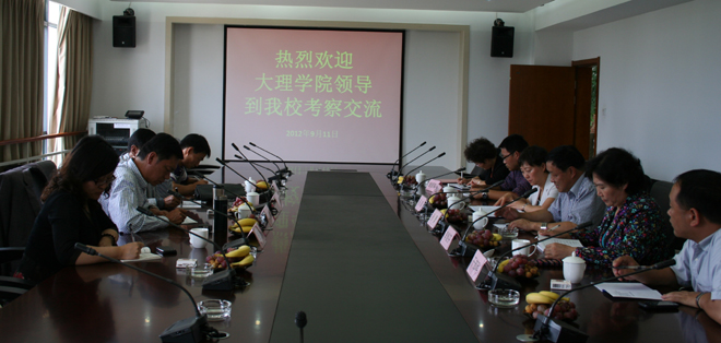 2012年9月11日下午,大理学院党委副书记段林、纪委书记张明以及组织部干部科长、组织科长一行4人就干部聘任工作到我校交流、考察。学校党委副书记孙勇,党委副书记、纪委书记李媛芬和组织部部长杨璐、副部长钱海鼎出席了交流会议。