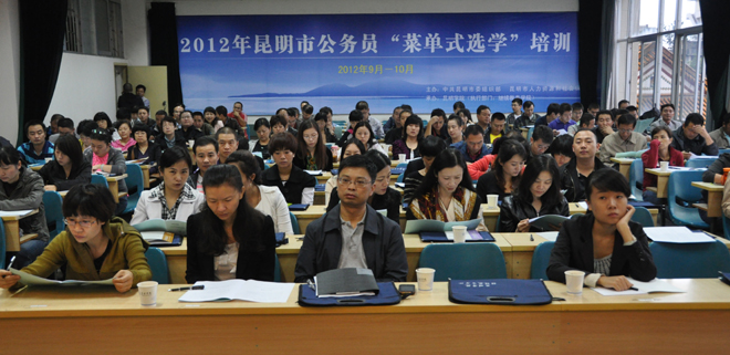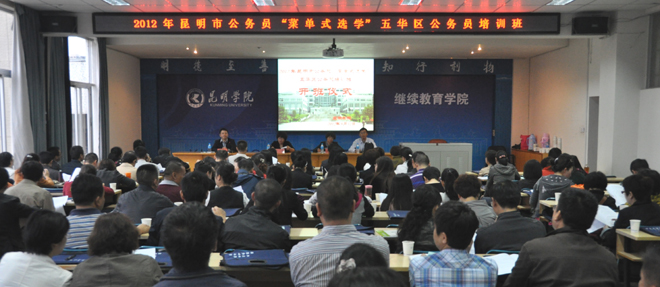 经我校继续教育学院的精心准备和积极申报,我校和云南大学、云南财经大学3所高校被确定为2012年昆明市公务员“菜单式选学”培训承办单位。除五华区公务员培训外,在接下来近两个月的时间内,我校还将承担来自昆明市财政局、石林县等部门和县区的400余名公务员的培训工作。