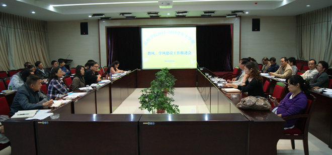 会议首先由教务处沈凡处长就我校教风建设的相关情况作发言,沈处长结合教育部印发的《高等学校教师职业道德规范》及普通高校本科教学工作合格评估的相关指标体系,对加强我校教风建设的重要性、紧迫性作了深入分析,从几个方面列举了我校教风建设的现状。最后沈处长从教务处的角度,提出了开展教风建设工作重点要解决的问题和加强教风建设的主要措施。重点要解决的问题是:1.加强师德修养、模范遵守教师职业道德规范;2、加强制度建设,规范教师社会兼职和校外活动,促使教师把主要精力投入到教学工作中;3.提高教师的业务素质;4.建立教风建设的保障机制和长效机制。加强教风建设的主要措施是:1.加强对教风建设的领导;2.在师资队伍建设工作中突出优良教风建设;3.完善规章制度,引导教师树立优良教风;4.加大教学过程监控和教学质量管理的力度,促进优良考风的建设;5、完善教师教学工作评价体系,加大奖惩力度;6.大力营造建设优良教风促学风的良好氛围。
