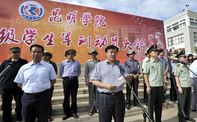 7月7日上午,我校2011级学生军训动员大会在聂耳广场隆重举行。出席开训动员大会的领导有:学校党委副书记孙勇、副校长李翔、宣传部主持工作副部长董学荣、教务处副处长王韬、学生处处长刘宜萍、保卫处处长方永昆、各院(系)主管学生工作领导,武警边防部队士官学校副校长苏强、训练部部长李荣、学生军训团团长陈应海、继续教育处处长孙利辉。各院(系)带队辅导员、全体承训官兵和2011级4865名参训同学参加了动员大会。大会由李翔副校长主持。