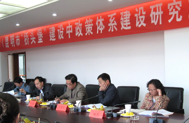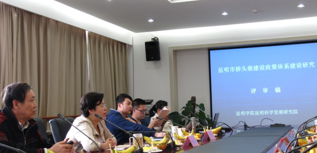 4月11日下午,由昆明市发改委委托yl23455永利官网研究课题《昆明市“桥头堡”建设中政策体系建设研究》专家评审会在我校举行。省政府研究室副主任孔灿,市委政研室主任袁培文,市政府研究室主任王笑平,市社科联主席杨芳,市政府副秘书长、昆明市金融办主任洪维智,昆明市发改委黄建玮处长,以及学校科研处负责人和课题组全体成员,参加了评审会。评审会由科发院黄继元教授主持。