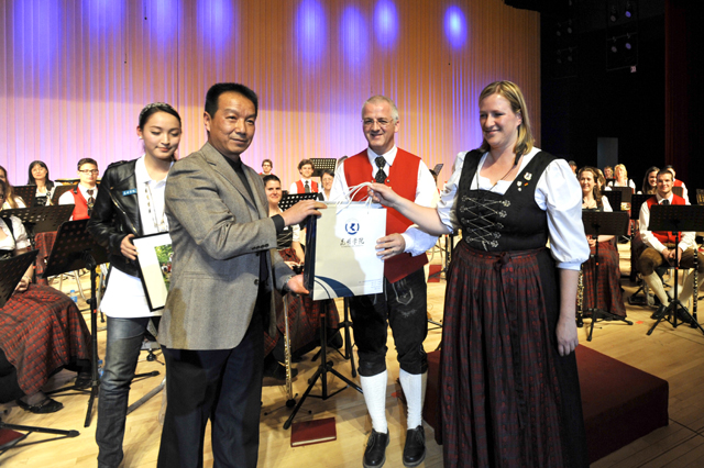 随后,德国慕尼黑Eichenau管乐团为我校师生演奏了安东尼•德沃夏克的《第九交响曲<新世界>》,小约翰•施特劳斯的《皇帝圆舞曲》,居塞比•威尔第的《歌剧<拿布果>序曲》和贝多芬的《欢乐颂》等耳熟能详的经典曲目。欢快的《米老鼠进行曲》和《巴伐利亚民间歌曲》将整场演出推向高潮,应观众的热情要求,乐团加演了5首安可曲目。其中,改编自云南彝族民乐的《阿老表》,熟悉的旋律深深感动现场观众。最后,音乐会在《给予我们和平》的优美旋律中圆满结束,全体观众起立向德国艺术家们的精湛表演致敬并抱以经久不息的掌声。演出结束后,德国艺术家们还亲切地与现场师生合影留念。