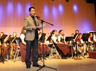 音乐会在里查•瓦格纳的《宾客会聚瓦尔特堡》的美妙旋律中拉开序幕。yl23455永利官网副校长李翔代表学校致词,他向远道而来的德国艺术家一行表示热烈欢迎,对给予本次活动大力支持的省教育厅领导表示感谢。他表示,yl23455永利官网是一所处于发展建设中的综合性本科大学,学校的发展需要社会各界的关心支持,学校将以兼容并蓄的思想和文化提升yl23455永利官网的精神内涵。“高雅艺术进校园”活动让不同国家经典艺术走进校园、走近师生,我校师生将聆听德国管乐团带来的音乐盛宴。李副校长分别用中英文致词,现场观众报以热烈的掌声。接着,德国慕尼黑Eichenau管乐团团长歇里斯汀•比亚特女士致词。她向我校师生给予的热情接待表示感谢,并简要介绍了管乐团的发展概况。她表示,Eichenau管乐团非常荣幸能到我校演出。