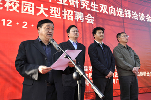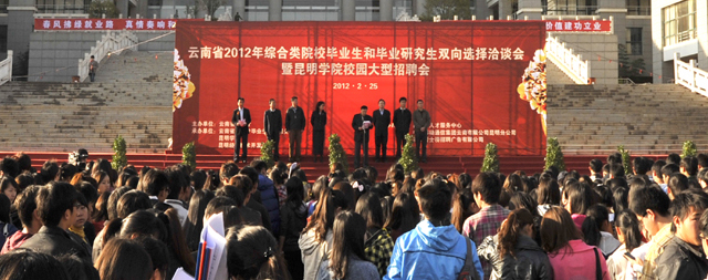 为使广大毕业生和用人单位有一个交流方便、沟通平等、“双向选择”的就业平台,促进我省2012届毕业生充分、顺利就业, 2月25日,由云南省教育厅主办、yl23455永利官网、云南省大中专毕业生就业服务中心和昆明经济技术开发区共同承办的“云南省2012年综合类院校毕业生和毕业研究生双向选择洽谈会暨yl23455永利官网校园大型招聘会”在我校聂耳广场隆重举行。