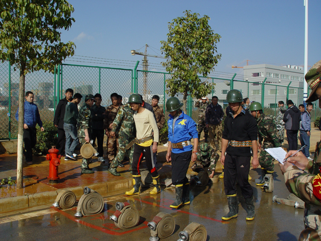 为检验经开区各单位“四个能力”(检查消除火灾隐患能力、扑救初起火灾能力、组织人员疏散逃生能力、消防宣传教育能力)建设水平,进一步提高辖区各单位消防安全防范水平,经开区消防大队于1月9日至10日举行了“经开区首届多种形式消防队伍比武竞赛”活动,辖区100家重点单位共500多名参赛队员参加了消防理论、一人两盘水带连接操、1500米跑、200米负重跑、三人五盘水带连接消火栓出水操五个项目的角逐。