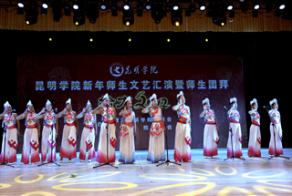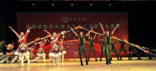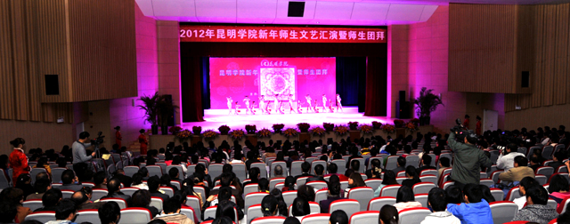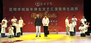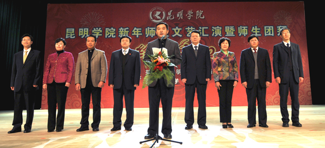 活动上,全体学校领导走上主席台给全校师生拜年。校党委书记梁晓谷代表学校党政领导班子向全校师生员工致新年贺词。梁书记表示:在过去的2011年,学校按照“超常规、跨越式、追赶型”的发展思路,全力、全方位加强内涵建设,教学、科研、管理和服务的水平大幅提升,学校各项事业全面、协调发展,在建设“全国地方同类高校领先、云南省一流、中国知名的高水平、特色浓、区域性、开放型、国际化的教学科研型综合大学”付出了艰苦的努力,在全校师生共同努力下,2011年我校学科建设、学生工作、对外交流合作、后勤社会化改革、新校园建设、党建和党风廉政建设等各项工作取得突出成绩。省委第九次党代会为我们描绘了宏伟蓝图;学校“十二五”规划为我们指明了努力的方向。新的一年,学校将继续深入推进内涵建设,不断提高教学、科研整体水平,不断加强和改善管理,不断提高服务质量,继续坚持以服务地方经济社会为己任,立足昆明、研究昆明、服务昆明,主动融入地方经济发展;继续推进党建和党风廉政建设,在全校师生员工和离退休同志的支持下,学校将以崭新的面貌走进2012年。
