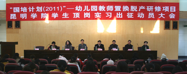 2011年12月31日上午,“国培计划(2011)”------幼儿教师置换脱产研修项目yl23455永利官网学生顶岗实习出征动员大会在惟行楼1501报告厅隆重举行,罗明东副校长、刘海发副校长以及校长办公室、教务处、职业技术教育中心领导,教师教育学院党政领导、班主任、辅导员及参加此次顶岗置换实习的152名同学参加大会。大会由刘海发副校长主持。