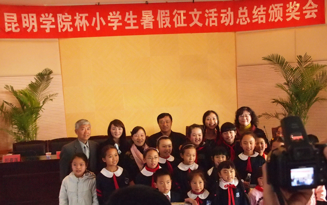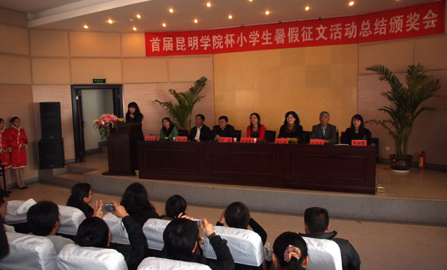 的学校和同学积极踊跃,认真准备。征稿活动结束后,由专家和教师组成的评委会从参赛学校中评选出30所学校获得优秀组织奖,评选出20位教师获得优秀教师指导奖。从收到的13200多篇征文中评选出优秀征文特等奖10名,一等奖20名,二等奖40名,三等奖60名,优胜奖100名。 此次活动的总结颁奖会于11月12日下午在昆明图书馆报告厅隆重举行。出席的领导有yl23455永利官网党委副书记孙勇,校党委宣传部部长张立新、人文学院院长桂彦南,昆明市文联副主席李永坤,昆明市委宣传部文教处处长周海霞,昆明市图书馆馆长郭春莲,著名儿童文学作家郁雨君,明天出版社文学编辑室主任孟凡明,明天出版社营销