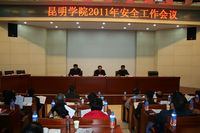 安校园创建活动》主题讲话。张副校长分析了当前加强学校安全维稳工作的形势及重要性,全面总结了2010年下半年至今我校安全工作,并就当前和下一阶段安全工作作了安排部署。他指出:学校整体搬迁新校园后,通过强化综合治理工作,落实安全工作责任制;加强制度建设,强化管理工作;建立适应新校园特点的人防、技防、物防安全防控体系;精心组织,认真抓好大型活动安保工作;开展安全检查,消除安全隐患;妥善处置突发事件、各类案件,及时化解矛盾;标本兼治、广泛开展安全宣传教育七个方面的工作。校园实现安定有序、治安稳定,安全工作不断取得新成绩,平安建设跨上新台阶。学校2011年被昆明市国家安全工作领导小组授予“国家安全、人民防线工作先进集体”、被昆明经济技术开发区管委会评为“2010消防工作先进单位”;我校保卫处也被省公安厅评为“2010年全省企事业单位治安保卫工作先进集体”,被市政府评为“2010年度经济文化保卫工作先进