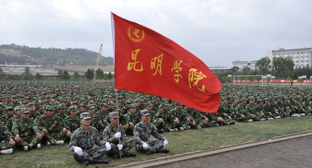 6月25日上午,我校运动场上隆重举行了2010级学生军训开训动员大会。昆明陆军学院军训办主任朱平大校、副主任田景大校,我校孙勇副书记、熊晶副校长、学生处吴蓉处长、后勤处冯坚处长、宣传部沈中灿副部长、学生处晁丽华副处长、教务处王韬副处长、各院(系)分管学生工作的领导及辅导员、2010级4646名学生参加了开训动员大会。开训动员大会由熊晶副校长主持。