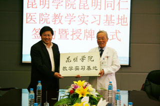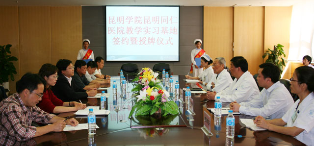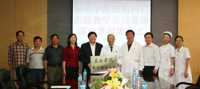 会上,罗明东副校长与蔺锡侯院长就教学实习基地合作协议签字,罗副校长并向蔺院长授牌。这标志着我校医学院与昆明同仁医院的合作正式启动,我校今年7月份起,首批护理专业学生将赴昆明同仁医院,开始长达10个月的实习期。我校医学院的学生又多了一条实战渠道和场地。