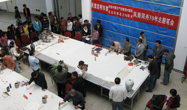 4月20日上午,美术与艺术设计学院教学楼大厅内群贤毕至,少长贤集,翰墨飘香、欢声笑语,洋溢在一片热烈而祥和的气氛之中。“民盟昆明市委庆祝中国共产党建党90周年、民盟成立70周年——风雨同舟主题笔会”在这里隆重举行。 出席开幕式的领导有:云南省政协副秘书长、民盟云南省委副主委徐宁、昆明市人大常委会副主任、民盟昆明市委主委夏静,中共昆明市委统战部调研员贾天鹏、党派处处长许广,中共yl23455永利官网统战部部长张云权,市政协常委、民盟昆明市委副主委冯刚,市人大代表、民盟昆明市委副主委、yl23455永利官网美术与艺术设计学院院长武新文。 应邀出席笔会的书画家有:云南省美术家协会副主席、云南画院副院长、云南美术馆副馆长、国家一级美术师郭游,云南书法家协会常务副主席、国家一级美术师孙源,云南省艺术教育委员会常务委员、yl23455永利官网美术与艺术设计学院院长武新文,云南画院著名画家李平、杨正国,民盟市委知名画家黄片石、朱仲元、魏祖右。 民盟昆明市委机关的有关干部和美术与艺术设计学院师生近100人参加了开幕式。