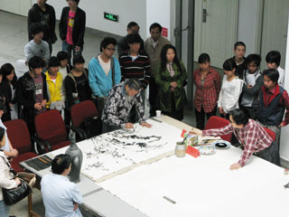 笔会开幕式由民盟昆明市委副主委冯刚主持,民盟昆明市委副主委、yl23455永利官网美术与艺术设计学院院长武新文向与会领导、书画家和师生致辞。 在热烈而祥和的气氛中,书画家们以饱满的热情、精湛的技艺、生动的形象、挥毫泼墨、借物抒情,热情讴歌中国共产党90年的丰功伟绩和改革开放波澜壮阔的光辉历程,歌颂民盟70年与中国共产党风雨同舟、荣辱与共的光辉历史。 在我校举办省、市、学校盟内书画名家笔会活动,用书画艺术传承了多党合作历史,弘扬统一战线文化,共同创作和谐书画作品,必将有利于校内外盟员联手共创和谐校园、和谐昆明,和谐社会,必将促进省、市盟内上下级之间和校内外书画家之间的相互交流和切磋,必将为我校和昆明市的和谐文化建设增添浓墨重彩的一笔。 在教学楼大厅,书画家们精益求精的创作表演深深吸引着美术与艺术设计学院的师生们,他们十分珍惜各位书画名家的亲临指导和现场献艺的机会。本次笔会的举办,一方面起到了书画艺术的教育作用,让学生大开眼界,另一方面还为美术与艺术设计学院开展对外交流搭建了好的平台。