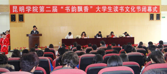 闭幕式上,文新系学生朗诵了《大观楼长联》,团委书记何昊宸老师对本次读书文化节作了总结并对本次读书文化节付出辛勤劳动的全体老师和同学致以最真挚的问候。他表示:当前,学院正处在改革发展的关键时期,在新的起点上,机遇与挑战并存。目前全院师生正在深入学习贯彻落实科学发展观,在全力加强内涵建设,提高教育教学质量和科研水平,今后,团委将把“读书文化节”作为一项丰富校园文化生活的精品活动持续开展下去。同时,充分利用读书文化节这一有效载体,举办更多更精彩的读书活动,不断提升读书文化节的影响力和文化品位。