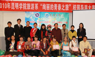 大赛在旅游系同学《云南美》的歌声中拉开序幕,经过初赛、复赛等环节选拔出来自全院各系的10位同学通过校园导游词讲解、才艺展示等环节的精彩表现,经过评委们认真细致的评定,最后,来自旅游系的王伟和陈洛凝同学并列第一名,来自旅游、文新、外语等系部的同学分获第二、三名。