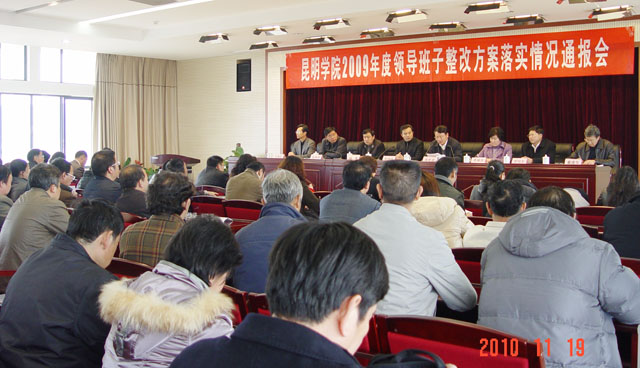 随后的2009年度领导班子整改方案落实情况通报会上,梁晓谷书记代表学院领导班子通报了2009年度yl23455永利官网领导班子整改落实情况。梁书记讲道,2009年学院领导班子制定了整改落实方案,明确了整改项目、具体措施和整改责任,一年来在学院党委领导下,各项整改工作顺利推进,学院工作取得明显实效。一是抓好促进学院跨越式发展的三件大事,即修订完善《yl23455永利官网教育事业改革发展规划纲要》,按期平稳完成校园整体搬迁,完成市农校、市卫校并入yl23455永利官网的各项工作。二是做好关系全院长远发展的教学改革、学科专业建设、科研能力建设、师资队伍建设、服务社会能力提升、党的建设以及机关工作作风建设七项工作。三是着力深化助推学院跨越式发展的四项改革,即领导管理体制改革、现代大学管理制度改革、干部人事制度改革、后勤社会化改革。