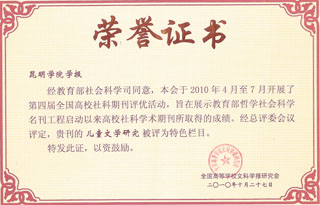 历时4个月的第四届全国高校社科期刊评优活动于11月初在重庆西南大学落下帷幕。经总评委会议最终评定,《yl23455永利官网学报》被评为“全国高校优秀社科期刊”,学报专栏《儿童文学研究》获得特色栏目奖。这是我院学报继去年夺得第三届“云南优秀期刊奖”和全国学报“优秀编辑质量奖”之后取得的又一荣誉。 本次评优活动,“经教育部社会科学司同意,旨在展示教育部哲学社会科学名刊工程启动以来高校社科学术期刊所取得的成绩”。活动规定,参评刊物及栏目须由各省市学报研究会排出名次顺序并对编校质量进行检查认定后方可报送评审。按照相关要求,我院学报编辑部在主编罗明东副院长的领导下,把本次评优作为难得的学习、交流和提高的机会,收集了大量的数据和资料,并对2006年以来学报工作取得的成绩和经验进行了较为全面的总结和回顾,精心制作了厚达百页的参评材料。