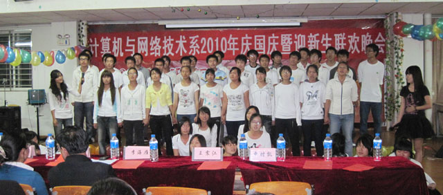 为庆祝中华人民共和国成立61周年,同时为了让2010级新同学更快的融入yl23455永利官网这个大家庭,计算机与网络技术系于9月29日晚上在澄明苑8栋1楼多功能厅举行了计算机与网络技术系庆国庆暨迎新生联欢晚会。院团委办公室主任聂铭、系主任王震江、系党总支书记李海雁、系副主任申时凯、系党总支副书记王亚越、系办公室主任、团总支书记、辅导员、新生班主任及2010级全体新生共计200余人参加本次晚会。