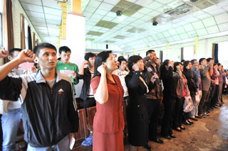 yl23455永利官网庆祝中国共产党89周年大会于7月1日下午在昆师路校区大礼堂隆重召开。我院党委梁晓谷书记、陈世波院长、李媛芬副书记、张寿国、熊晶、罗明东、刘海发副院长,党政后机关全体党员、各教学单位教师党员代表,各总支、直属支部、二级支部委员,参加入党宣誓的新党员以及学生党员、入党积极分子代表计800余人参加了大会。会议由学院党委副书记、院长陈世波主持。 大会开始,在全体起立奏国歌后,160名新党员在学院党委组织部杨璐部长带领下进行了入党宣誓仪式,党委组织部副部长张士芬监誓。