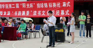 4月30日下午,yl23455永利官网第二届“阳光杯”排球锦标赛暨首届“书韵飘香”大学生读书文化节闭幕式在我院人民西路校区篮球场正式举行。出席此次闭幕式的领导及嘉宾有机关党总支书记梁艳萍老师、学生处处长吴蓉老师、团委书记何昊宸老师、团委副书记钱海鼎、王海艳老师以及各系团总支书记。
