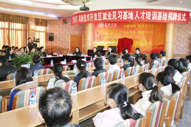 我院与昆明国家高新技术产业开发区建立“yl23455永利官网就业见习基地”和“昆明国家高新技术产业开发区人才培训基地”,并于12月9日在我院人民西路校区举行合作协议签字和揭牌仪式。我院党委书记梁晓谷、院长陈世波,副院长罗明东、刘海发等领导和昆明国家高新技术产业开发区党工委副书记逯康麟、昆明市教育局党委副书记姚宏、云南省教育厅学生处处长卢明、云南省农业厅劳动力办公室主任陈勇等领导、嘉宾出席仪式。合作协议签字和揭牌仪式由我院副院长刘海发主持。