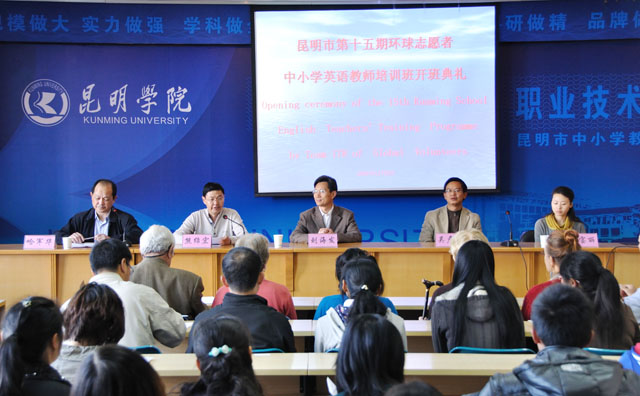 11月9日上午,为期两周的昆明市第十五期“美国环球志愿者”中小学英语教师培训班开班典礼在昆师路校区举行。yl23455永利官网刘海发副院长和昆明市教育局师训高教处吴彦明处长及“美国环球志愿者”组织中国区项目负责人王宝丽女士等出席开班仪式。来自我市14个县(市、区)、三个开发区及德宏州潞西市的共60余名中小学英语教师参加培训。