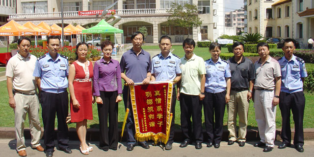 政法系晁丽华副书记代表政法系对余彬警官为学院昆师路校区大学生提供法律帮助和纠纷调解所做的工作表示了由衷感谢,保卫处方永昆副处长及政法系何杰副主任向余彬警官赠送了“真情系学子,明德筑和谐”的锦旗。
