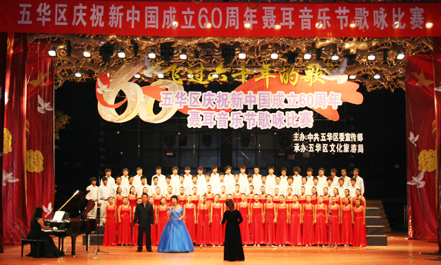 9月17日我院音乐系师生代表龙翔办事处在云南艺术剧院参加五华区庆祝新中国成立60周年——“飞过60年的歌”五华聂耳音乐节歌咏比赛。经过与来自五华辖区的19支高水平的艺术专业对手的激烈角逐,我院参赛的《祖国颂》、《在希望的田野上》获得第二名的成绩,为龙翔地区和学院赢得荣誉,受到学院和龙翔办事处一致好评。