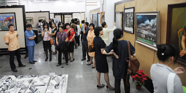 刘海发副院长在开幕式上宣布了本次参展作品获奖名单。本次评审按绘画、书法、摄影、艺术设计四种作品类别进行,共评审出专业与非专业教职工作品一等奖9个(其中并列奖1个),二等奖20个,三等奖24个,鼓励奖18个,共有71人次获奖。陈院长等与会领导和嘉宾为获奖作者代表颁发证书,并为开幕式剪彩。 获奖作者代表武新文老师发言时说,笔墨当随时代,作品表达了我院教职工对党和人民的深厚情感,对祖国壮丽山河的无比热爱,体现与时俱进,关注社会,共建和谐,奋发进取,提升艺术作品内涵的良好精神,展示了我院高扬人文精神,弘扬民族文化的艺术品格,是构建和谐校园,宣传学院,增进相互了解,营造良好学术氛围的有益之举。相信在学院党政的领导下,我们将克服一切困难,锐意进取,争取新的更大的胜利,我们的明天更加美好。 值得肯定的是,许多教职工以实际行动积极热情支持学院举办本次展览, 210多件参展作品,都是yl23455永利官网教师、行政管理人员、后勤职工和离退休同志的创作。绘画作品涵盖了中国画、油画、版画、水彩画、水粉画,书法作品有草书、隶书、篆书,摄影作品包括风景、人物,艺术设计包括平面设计、装饰绘画、工艺制作和陶艺等。这些作品,不仅数量较多,种类齐全,而且不管是专业组还是非专业组,都具有较好的思想性和艺术性,体现了yl23455永利官网广大教职工爱党爱国、爱乡爱校的真挚感情和对真善美的执着追求,反映了广大教职工朝气蓬勃、健康向上、奋发有为的精神风貌与多种才艺。
