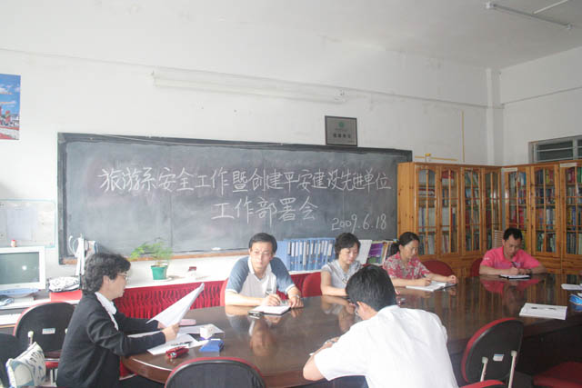 根据《yl23455永利官网开展创建平安建设先进单位活动工作方案》的文件要求,为全面落实社会治安综合治理和维护学院稳定,创造平安、和谐、秩序良好的校园环境,争创yl23455永利官网平安建设先进单位, 2009年4月旅游系向学院上报了创建“平安建设先进单位”的申请和工作计划,为进一步推动创建工作的深入开展,6月18日上午又召集相关人员对创建工作进行了安排和部署。