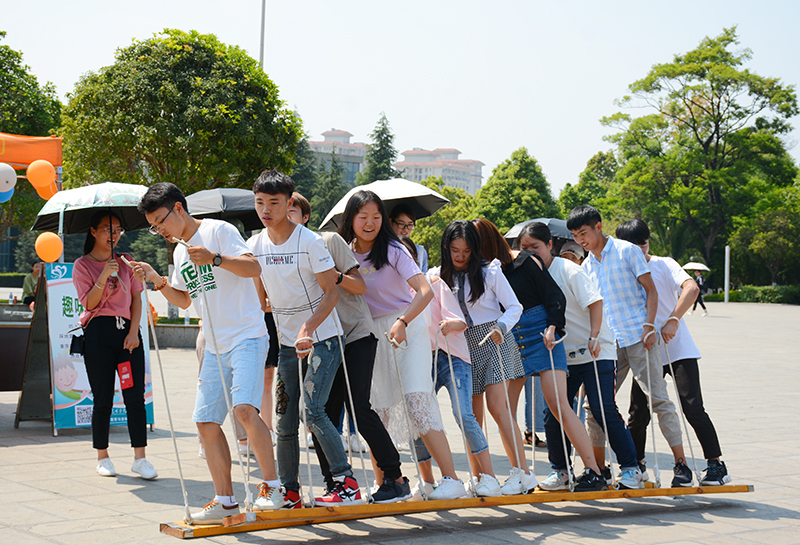 启动仪式后,在身着民族服饰的留学生们的带领下,老师、同学在欢快的乐曲中开展排长队打跳活动,活动序幕正式拉开。现场折玫瑰、心理百科竞答、跳绳联欢、千足虫、信任游戏、过电网、编花篮七大活动同时进行,学生们自愿参与,并可通过游戏环节赢取奖品。