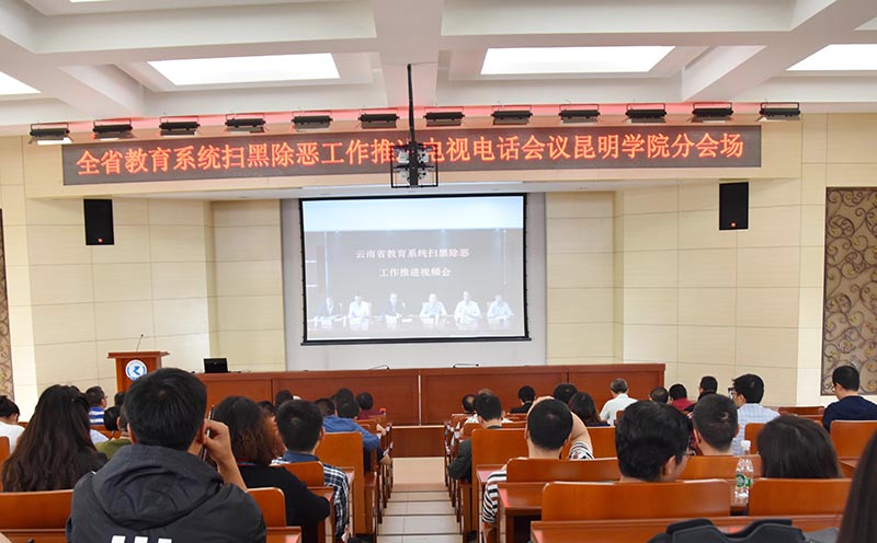 4月29日下午,云南省教育系统扫黑除恶工作推进电视电话视频会议召开。yl23455永利官网在办公楼D区三楼报告厅设分会场,学校党委书记陈永明,校长黎素梅等全体校领导。学校各职能部门和二级学院领导,经开区教育局所属中、小学和幼儿园领导,保卫处全体人员及云南飞虎保安公司驻校保安大队业务骨干共120余人在分会场参加会议。