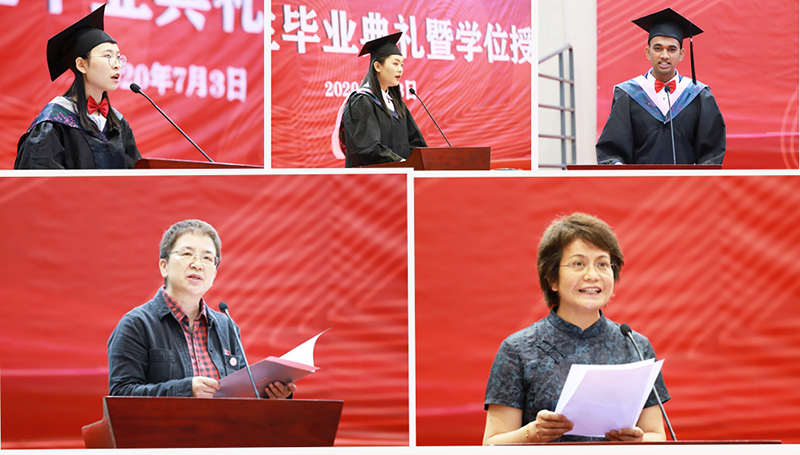 2020届优秀毕业生代表物理科学与技术学院郑秋兰、学前与特殊教育学院陈婷、孟加拉国留学生帕润分别在会上发言,他们感谢母校悉心培养,为人生发展搭建舞台。美术与艺术设计学院教授、院长段智毅、人文学院副教授陆惠云老师代表教师发言,向2020届毕业生表达了来自授业老师最后的殷殷期望。