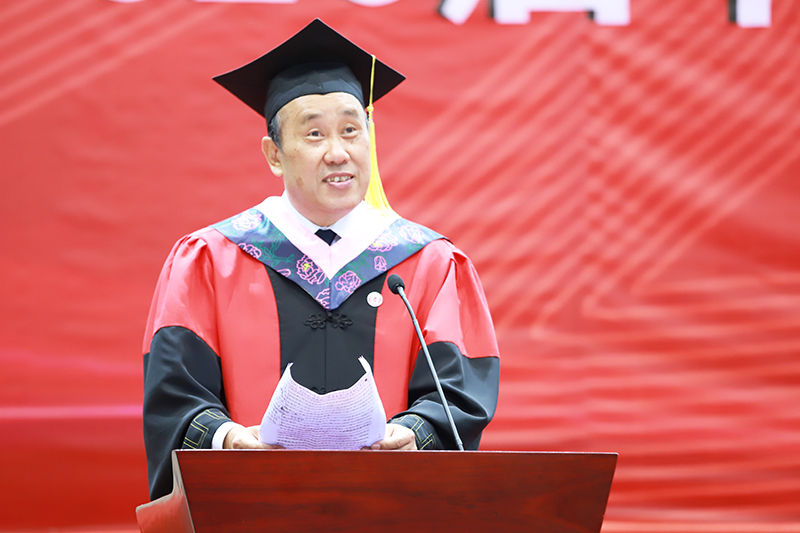 党委书记陈永明在典礼上致辞,他代表学校向2020届毕业生表示最热烈的祝贺,向辛勤培育的老师和悉心养育的父母,辛劳付出的宿管阿姨、保卫人员和后勤师傅们致以最崇高的敬意和最亲切的问候。