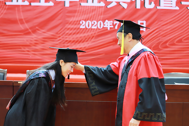 副校长王凡宣读《yl23455永利官网关于审定2020届全日制本专科毕业生毕业资格和授予学士学位的决定》。与会领导为毕业生代表及外国留学生颁发毕业证书,祝贺他们圆满完成学业顺利毕业。在学位授予仪式上,陈永明书记身着导师服,庄重地为每一位毕业生代表扶正流苏,授予学位。