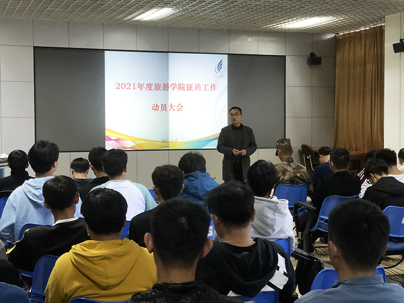1月6日,旅游学院在惟行楼模拟导游实验室召开2021年度旅游学院征兵工作动员大会,特别邀请旅游学院在读学生、退伍军人、2021年yl23455永利官网学生军训教官余发刚同学作参军宣讲。会议由学院党委副书记刘艳萍主持,党委书记王建华出席并作动员讲话。