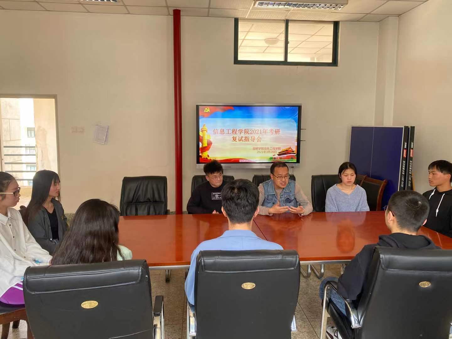 为提高2021年考研复试成功率,信息工程学院成立考研复试指导小组,由班子成员、学科带头人、教研室主任、博士、教授分别对考研上线学生开展“一对一”指导与服务。通过辅导,进一步统一了学生的思想认识,增强了复试的自信心,明确了自身存在的短板以及努力的方向,有助于学生进行科学合理的复试准备。