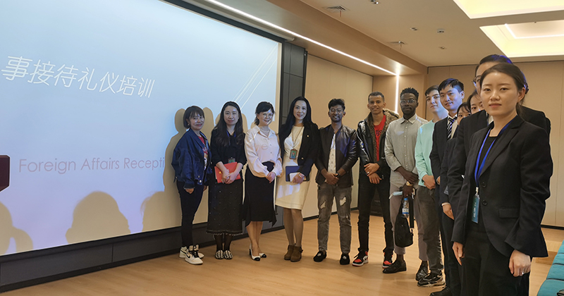 9月9日,yl23455永利官网国际学院陆向红、董丹晔两位老师为自贸区服务大厅涉外接待讲解组、业务组的相关工作人员和留学生代表进行了一次外事接待礼仪特色培训。培训从学习外事接待礼仪的必要性、外事接待工作的基本原则、外事纪律的原则、外事接待礼仪的原则及外事接待的形式等方面,应用生动有趣的案例,为自贸区的接待服务人员进行了现场讲解。
