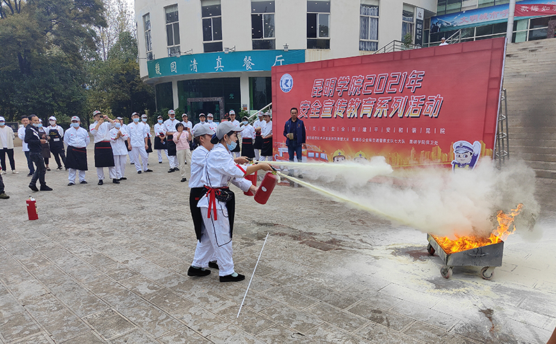 培训结束后,保卫处组织全体食堂员工进行灭火实战演练。